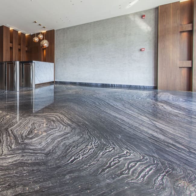 Этот камень часто выбирают для коммерческих объектов — ресторанов, гостиниц, салонов и офисных помещений. Его выразительный рисунок создает атмосферу премиальности, а износостойкость делает материал практичным при высокой проходимости. В интерьерах жилых домов мрамор Silver Wave помогает создать центр композиции: будь то кухня, гостиная или холл.